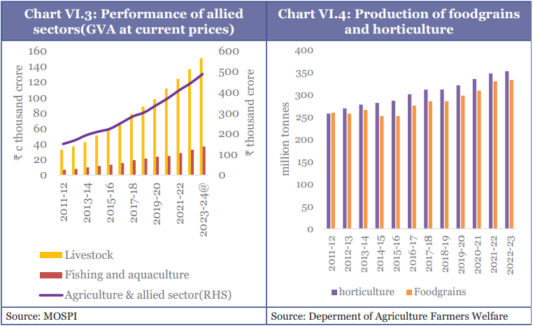 - Livestock sector: During FY 15 and FY24, it recorded a strong expansion, with its GVA increasing by nearly 195 %.