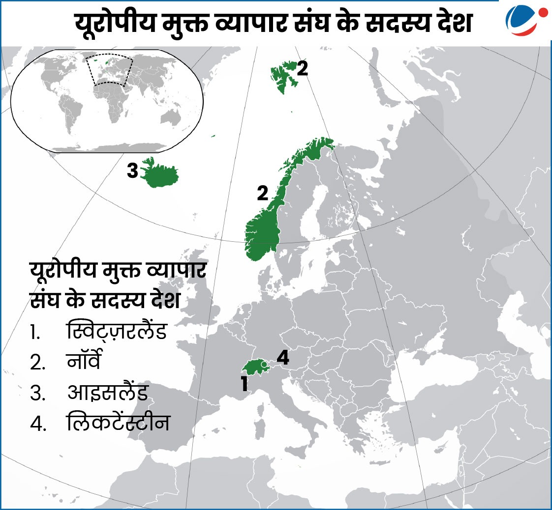 - भारत के लिए सीमित लाभ: वस्तुओं के व्यापार के संदर्भ में भारत को इस समझौते से सीमित लाभ होने की संभावना है। ऐसा इसलिए, क्योंकि EFTA समूह में पहले से ही टैरिफ दरें बहुत कम हैं और अधिकांश आयातों को पहले से ही टैरिफ-मुक्त रखा गया है।