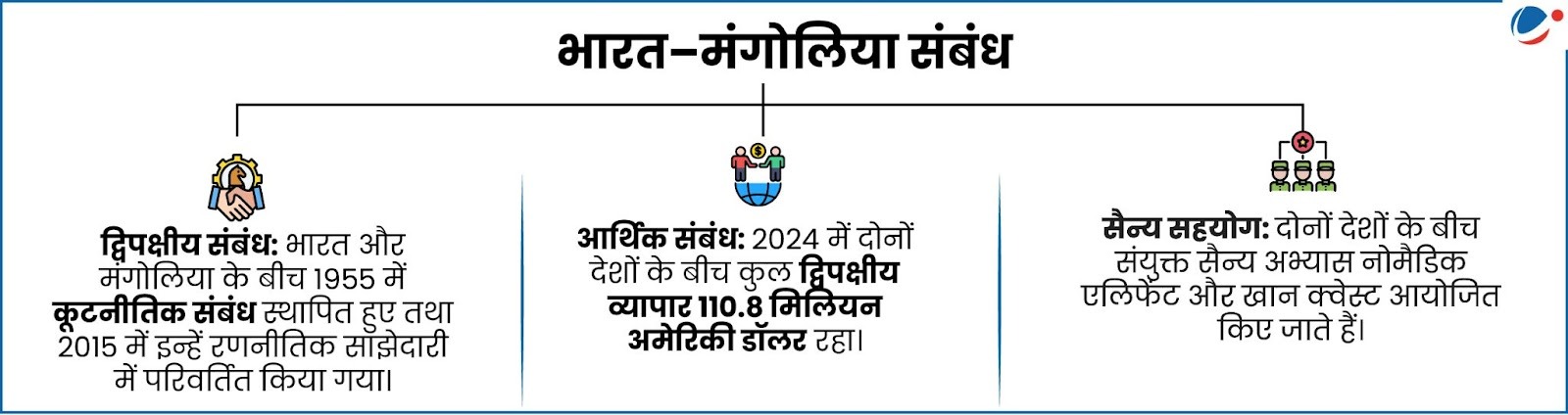 - सामरिक महत्व: मंगोलिया की सामरिक अवस्थिति भारत के लिए क्षेत्रीय स्थिरता और भू-राजनीतिक संतुलन बढ़ाने में अत्यंत महत्वपूर्ण है।