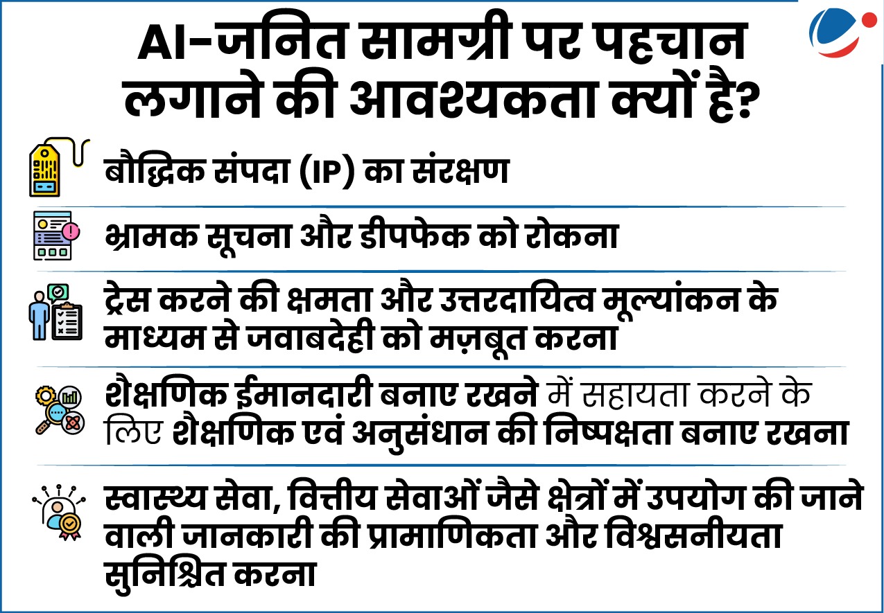 - वॉटरमार्किंग: AI वॉटरमार्किंग, एक समाधान प्रदान कर सकता है। इसमें AI-जनित कंटेंट में अमिट चिह्न लगाए जाते हैं, जो कंटेंट की उत्पत्ति एवं संपूर्णता को डिजिटल हस्ताक्षर के रूप में प्रमाणित करते हैं।