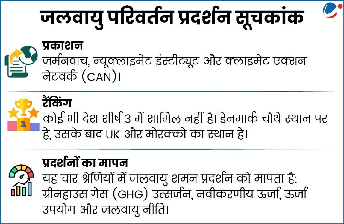 - इस वर्ष के CCPI में भारत 23वें स्थान पर है, जो उच्च प्रदर्शन करने वाले देश से मध्यम प्रदर्शन करने वाले देश की रैंक में आ गया है।
