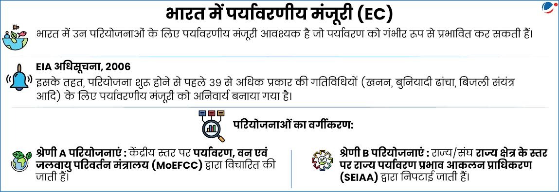 - पर्यावरणीय प्रभाव आकलन (EIA) अधिसूचना, 2006 में स्पष्ट रूप से किसी परियोजना के शुरू होने से पहले 'पूर्व-पर्यावरणीय मंजूरी' लेने का प्रावधान है।