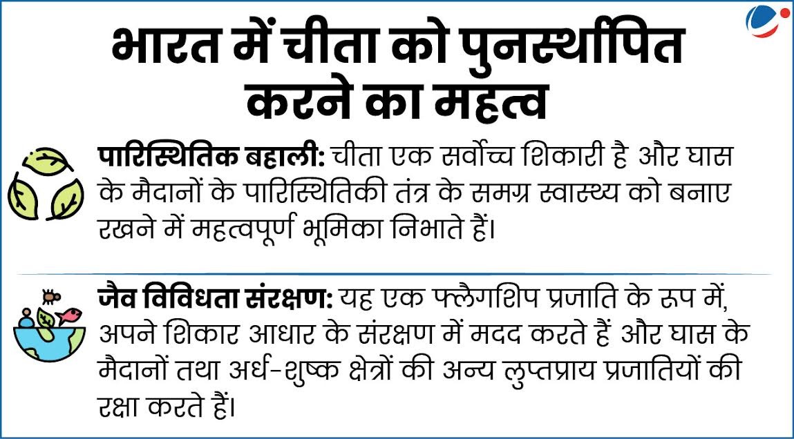 - इसके तहत 2022 में, नामीबिया से आठ चीतों को मध्य प्रदेश के कूनो राष्ट्रीय उद्यान में लाया गया। इसके बाद 2023 में दक्षिण अफ्रीका से बारह चीतों को लाया गया।