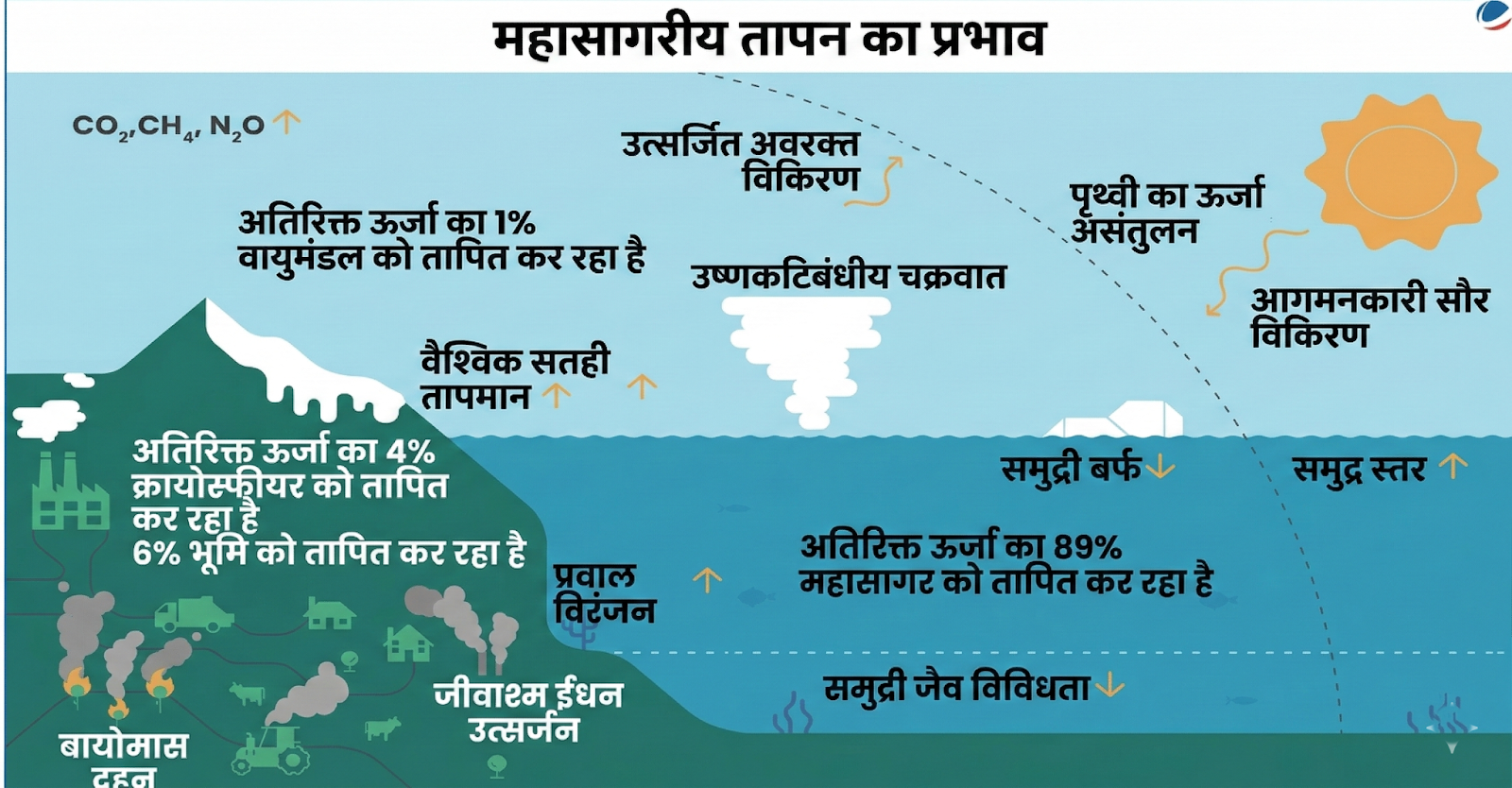 - ग्रीनहाउस गैसों द्वारा रोकी गई अतिरिक्त ऊष्मा का लगभग 90% हिस्सा महासागरों द्वारा अवशोषित किया जाता है। यह पुष्टि करता है कि महासागर ग्लोबल वार्मिंग के प्रभाव को कम करने वाले प्राथमिक माध्यम (बफर) हैं।