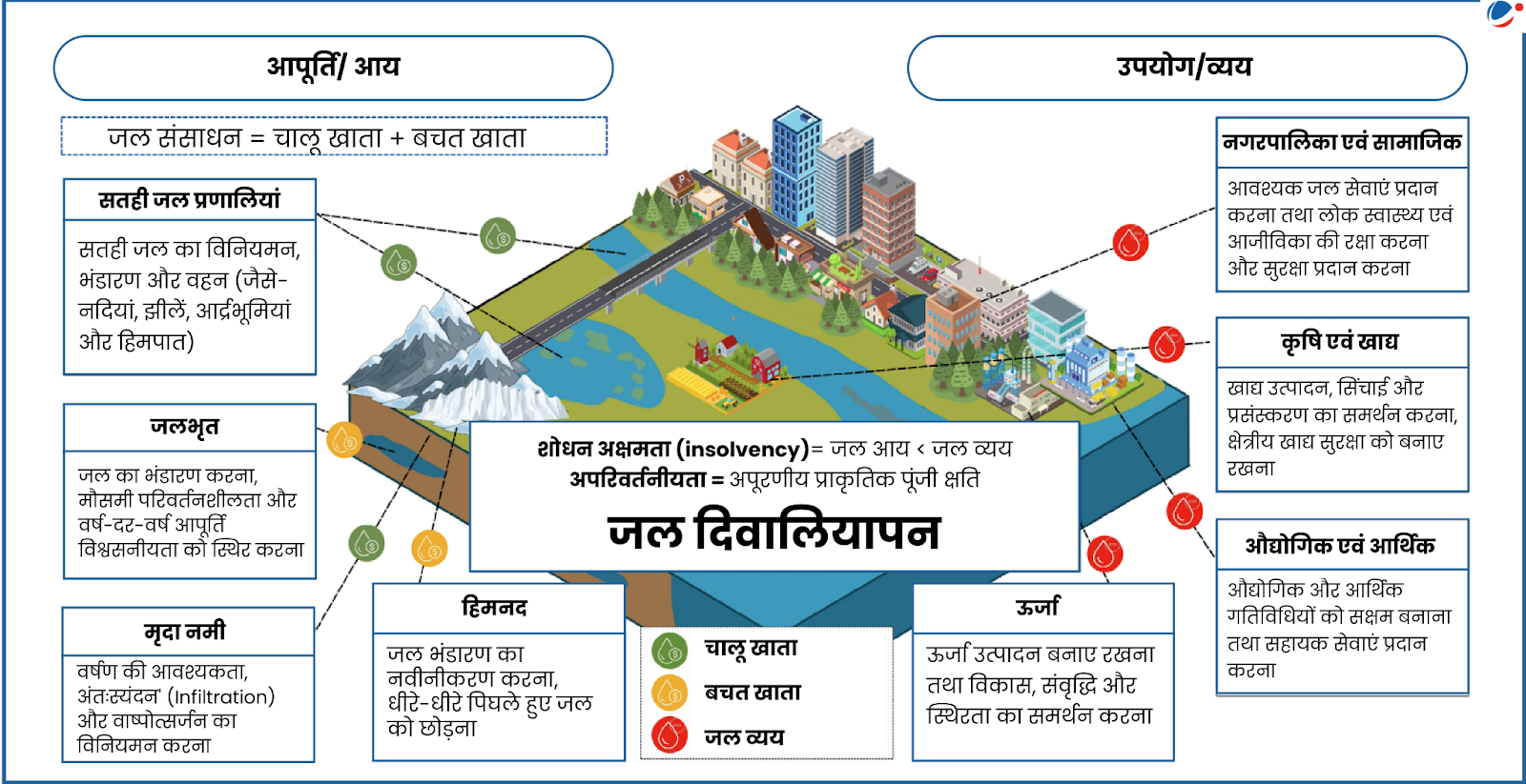 - जल दिवालियापन: यह मानव-जल प्रणाली की वह स्थायी संकट-पश्चात स्थिति है, जिसमें दीर्घकालिक जल उपयोग नवीकरणीय अंतर्वाहों (renewable inflows) और सुरक्षित निष्कर्षण सीमाओं से अधिक हो जाता है। इसके कारण जल संसाधनों का ऐसा क्षरण हुआ है, जिनका इनका अब पुनर्भरण होना लगभग असंभव है।