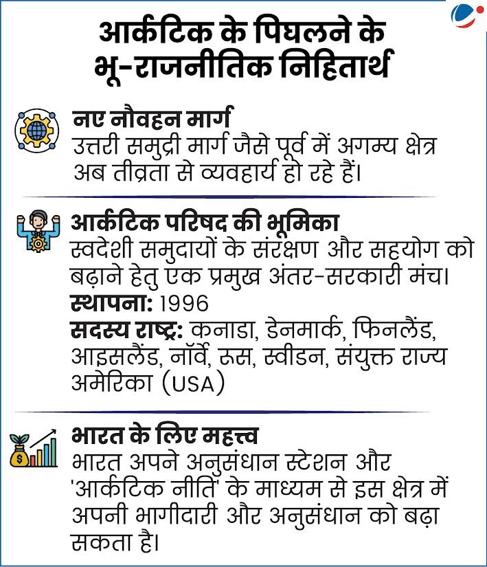 - पिछले 10 वर्ष आर्कटिक के इतिहास के 10 सबसे गर्म वर्ष रहे हैं।