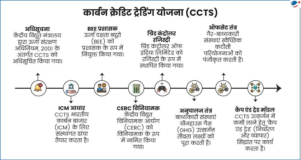 - अनुपालन तंत्र: जो इकाइयां लक्ष्य पूरा करने में विफल रहेंगी, उन्हें कमी को पूरा करने के लिए कार्बन क्रेडिट प्रमाण-पत्र (CCCs) खरीदना होगा।