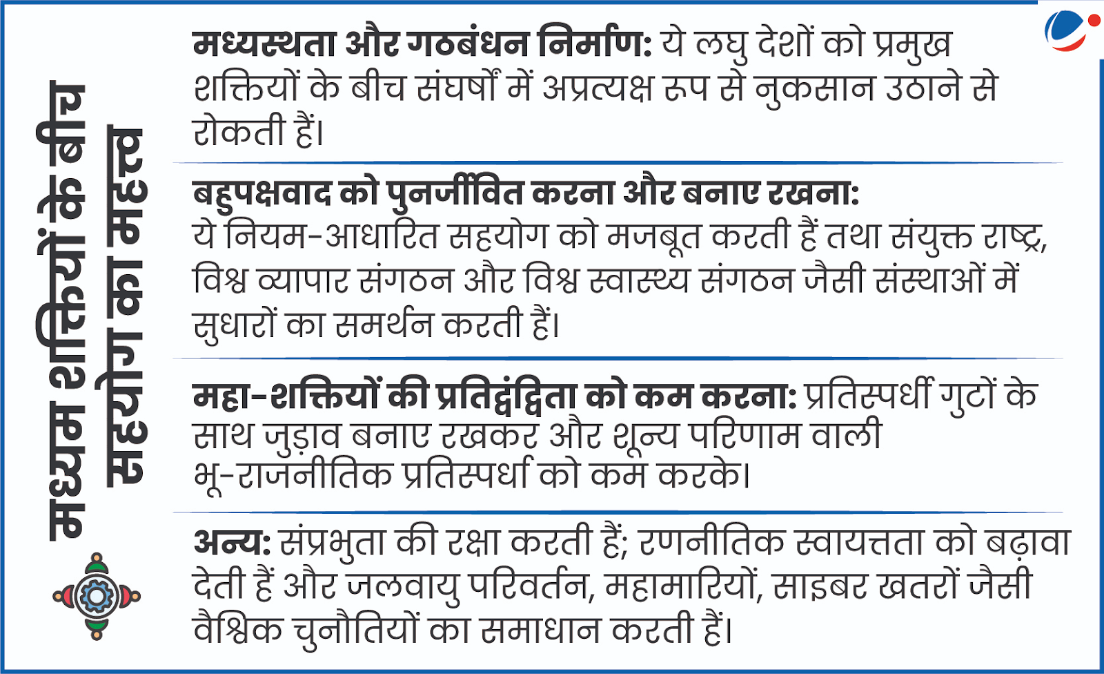 - मध्यम शक्तियां (Middle Powers): ये वे देश हैं, जो महा-शक्तियों से नीचे आते हैं। हालांकि, वे अंतर्राष्ट्रीय व्यवस्था पर हावी नहीं होते, लेकिन उनके पास महत्वपूर्ण राजनयिक, आर्थिक, तकनीकी या वैचारिक प्रभाव होता है।