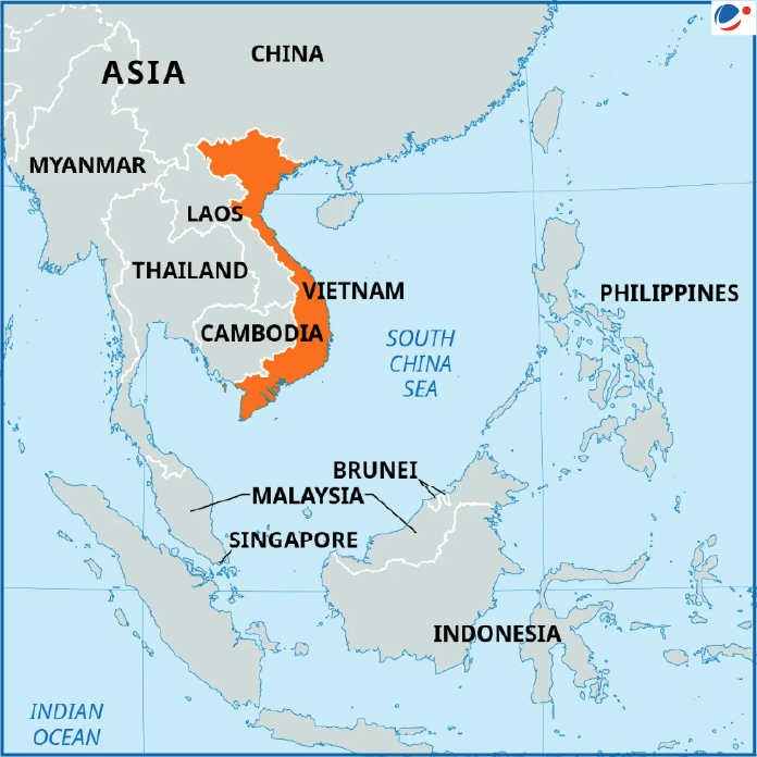 • अवस्थिति: दक्षिण पूर्व एशिया की मुख्य भूमि के पूर्वी भाग में स्थित है।