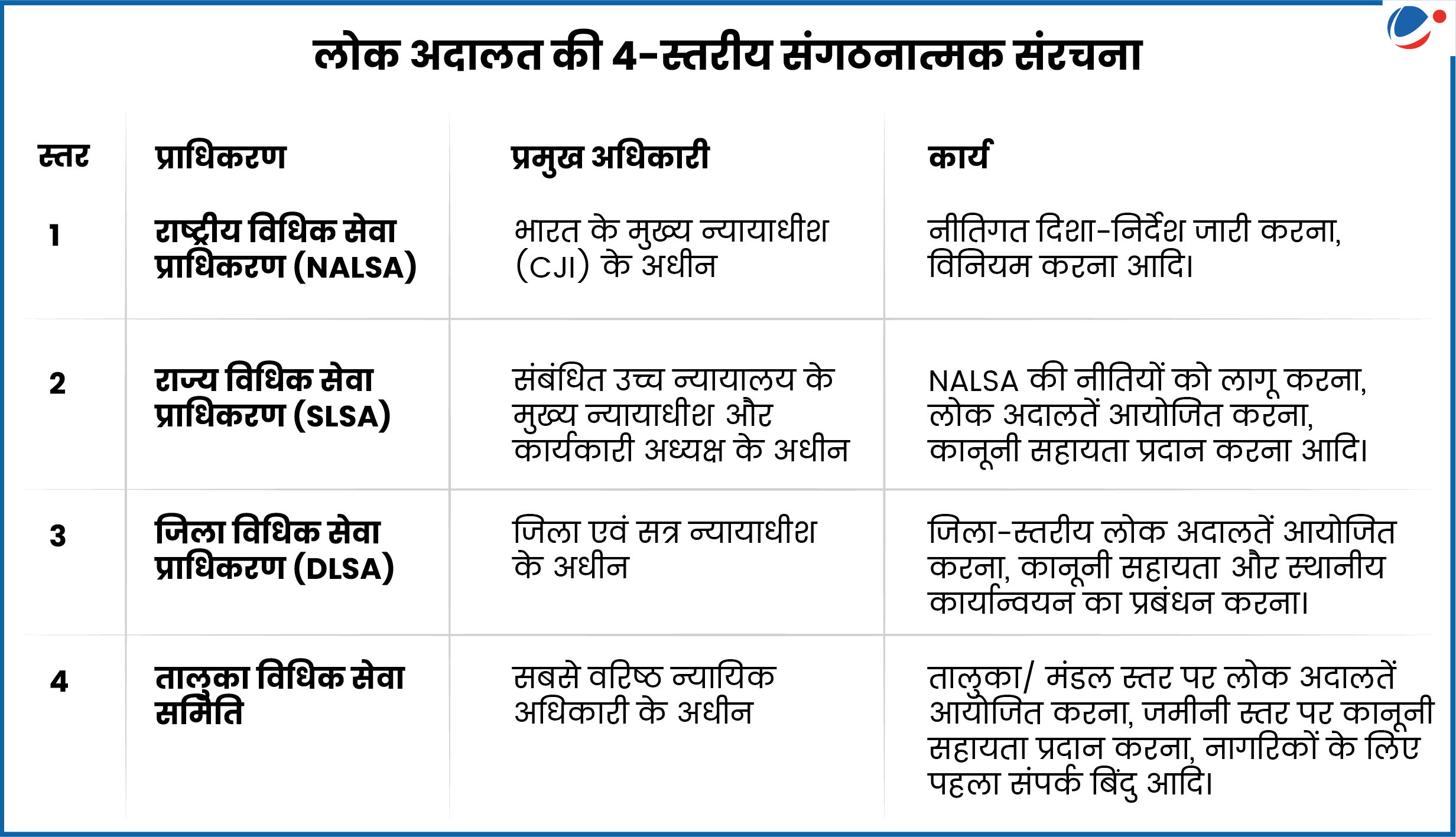 - प्राधिकरण: लोक अदालत को राष्ट्रीय विधिक सेवा प्राधिकरण (NALSA) द्वारा आयोजित किया जाता है। भारत का मुख्य न्यायाधीश (CJI) NALSA का मुख्य संरक्षक (Patron-in-Chief) होता है।