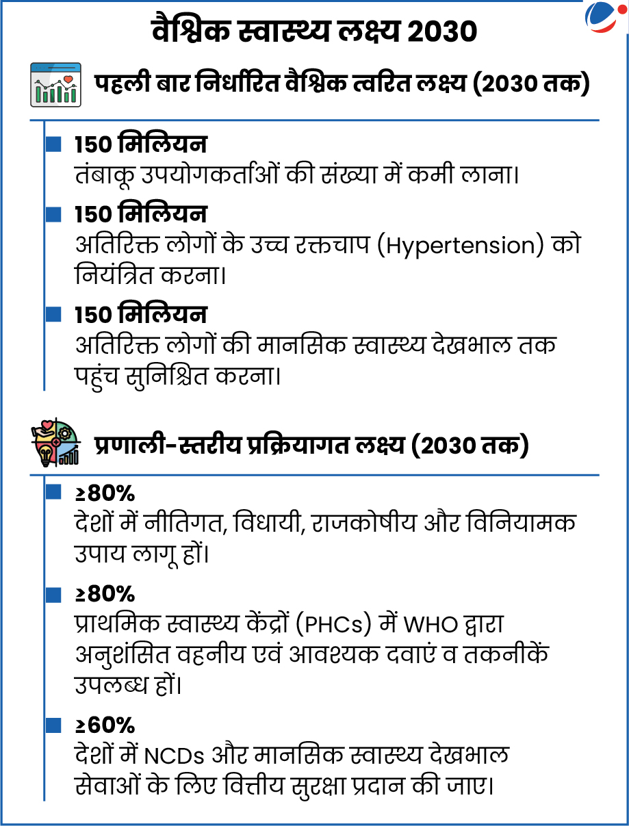 यह पहली बार है, जब 80वीं संयुक्त राष्ट्र महासभा (UNGA) में गैर-संचारी रोगों (NCDs) और मानसिक स्वास्थ्य को संयुक्त रूप से संबोधित करने के लिए एक राजनीतिक घोषणा-पत्र को अपनाया गया। इसमें 2030 के लिए विशिष्ट लक्ष्य निर्धारित किए गए हैं (इंफोग्राफिक्स देखिए)।
