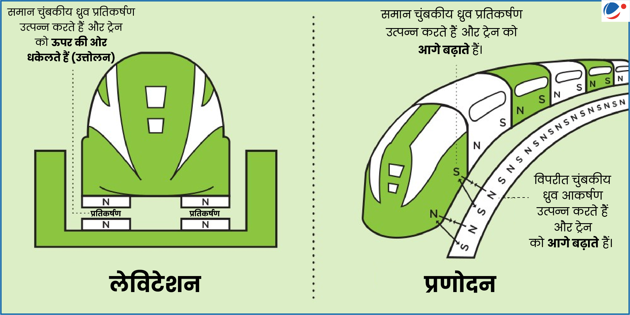 - सिद्धांत: यह ट्रेन को पटरी से कुछ ऊपर उठाने के लिए विद्युत चुंबकीय बलों का उपयोग करती है। इससे पहिए और ट्रेन के बीच घर्षण समाप्त हो जाता है।