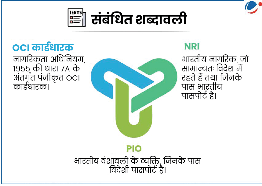 - इनमें शामिल हैं: अनिवासी भारतीय (NRI); भारतीय मूल के व्यक्ति (PIO) और विदेशी भारतीय नागरिक (OCI)