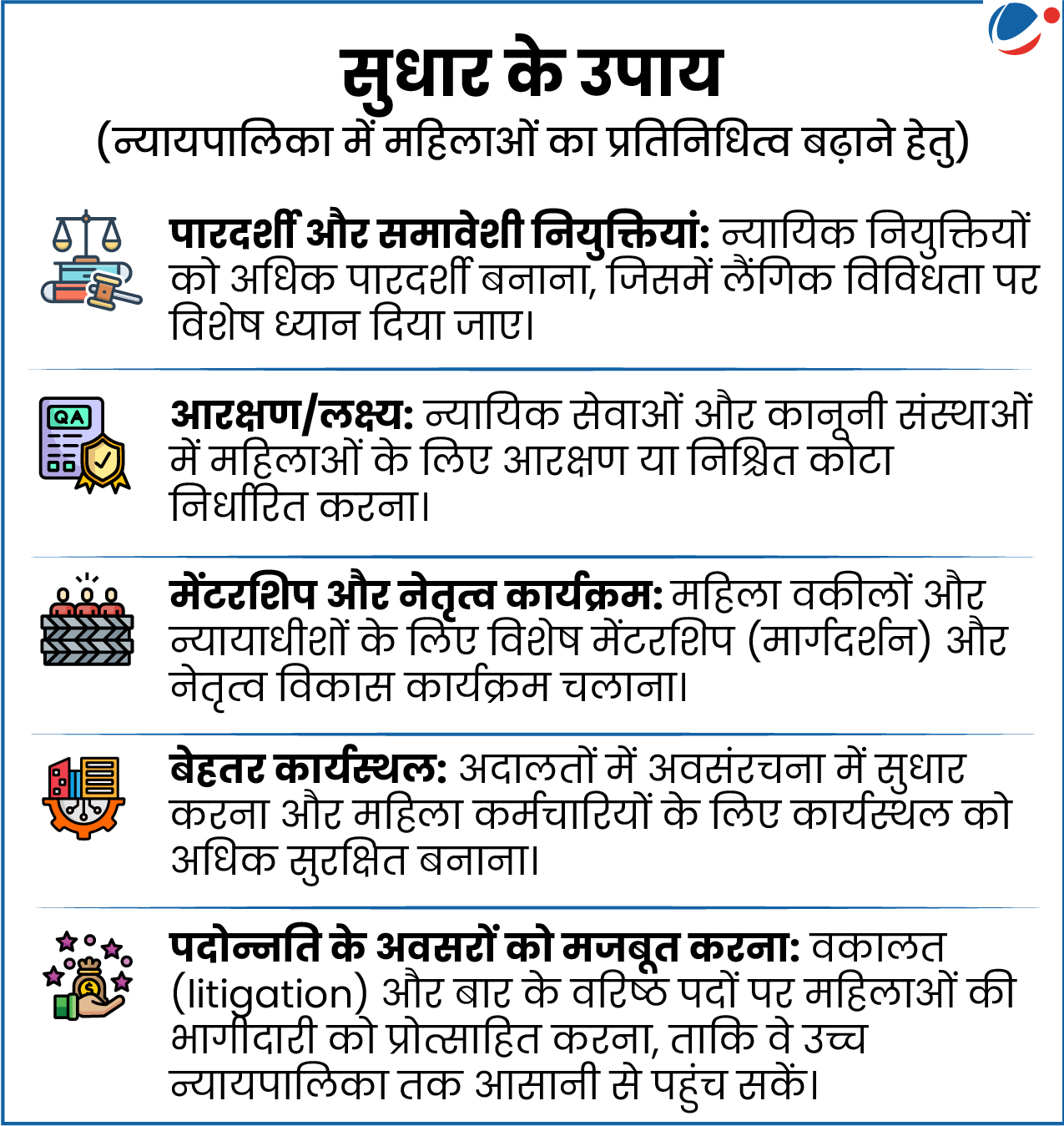 - प्रगति में बाधा: महिलाएं न्यायपालिका में प्रवेश तो करती हैं, लेकिन योग्यता होने के बावजूद उच्च न्यायालयों तक कम ही पहुंच पाती हैं।