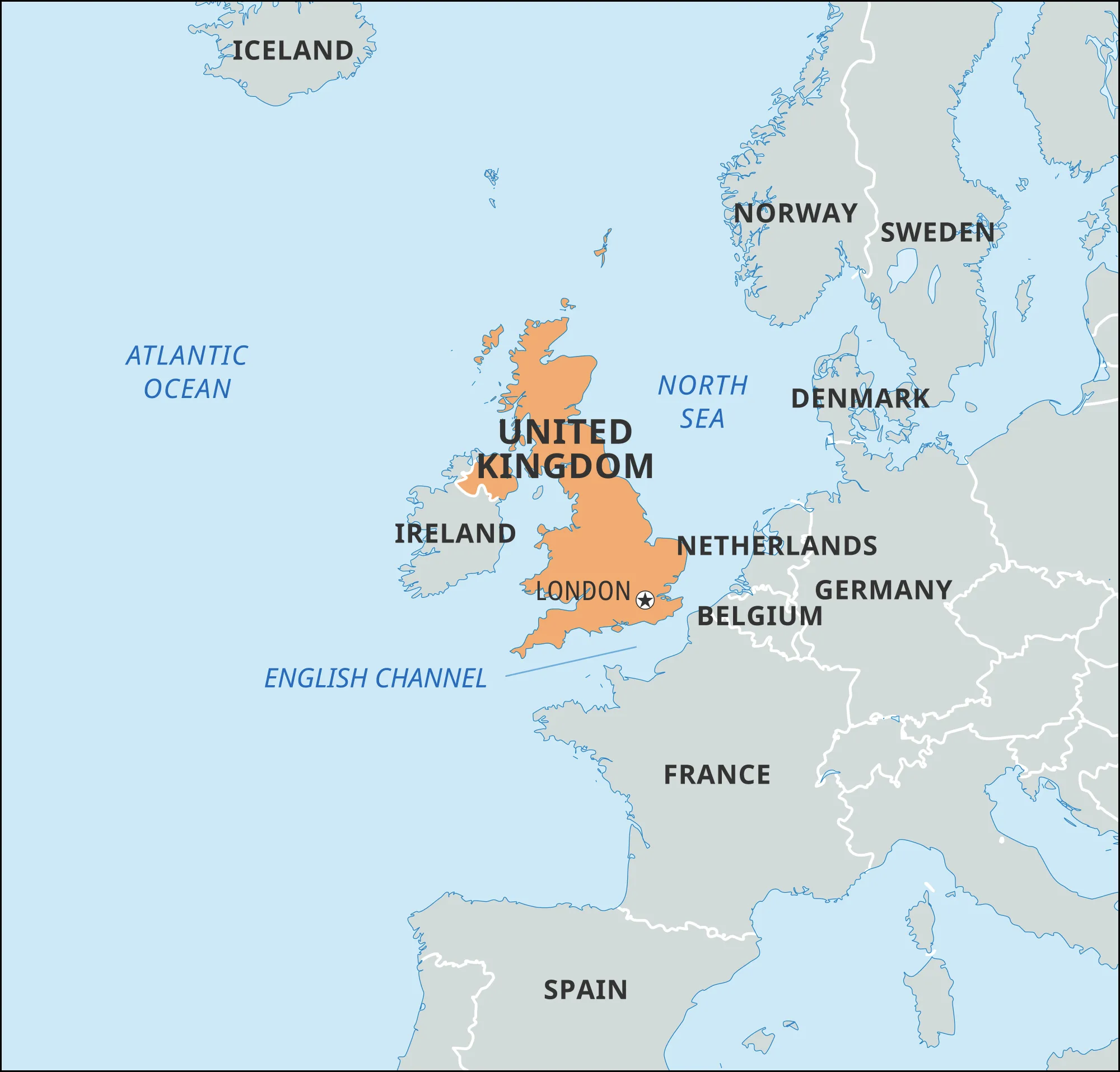 - यह मुख्य भूमि यूरोप के उत्तर-पश्चिम में स्थित है।
