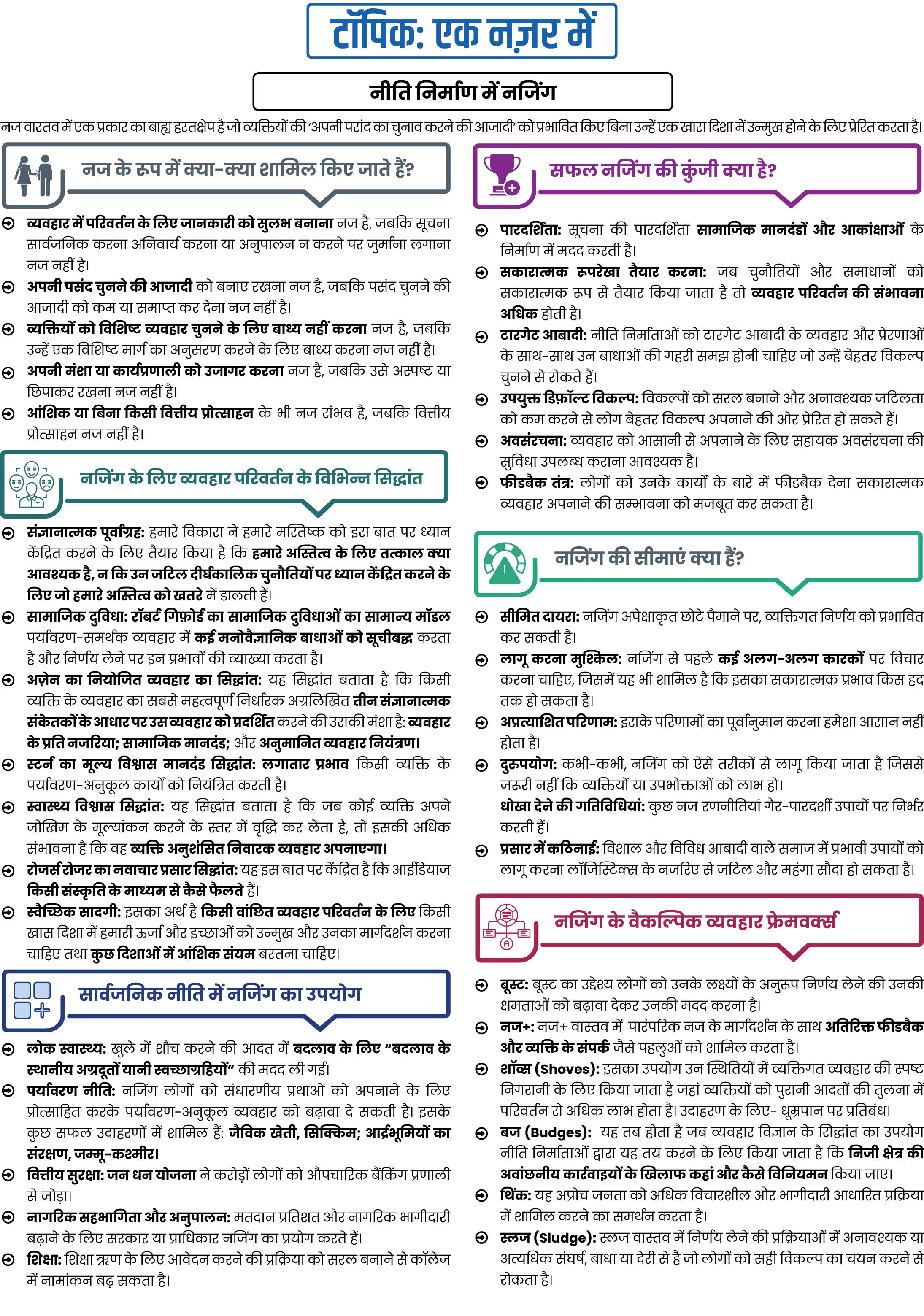 व्यक्तिगत व्यवहार को बदलने के लिए, नीति निर्माता व्यवहार विज्ञान सिद्धांतों का सहारा ले सकते हैं। इससे यह समझने में मदद मिलेगी कि कैसे लोग उपलब्ध जानकारी का उपयोग करके अपना विकल्प चुनते हैं। ऐसा ही एक व्यवहार विज्ञान सिद्धांत है- “नज थ्योरी” (Nudge theory)।