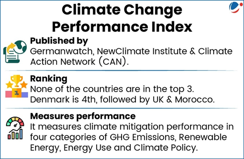 - India ranks 23rd, going from a high performer to a medium one in this year’s CCPI.