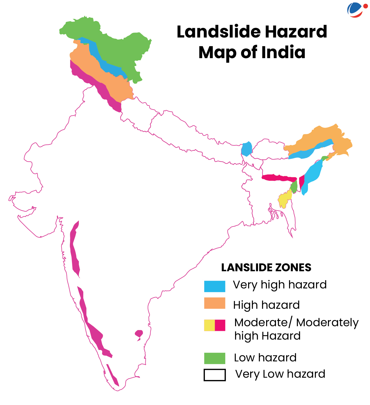 - India’s Vulnerability: 12.6% of land area is prone to landslide hazard as per ISRO’s 2023 Landslide Atlas of India.