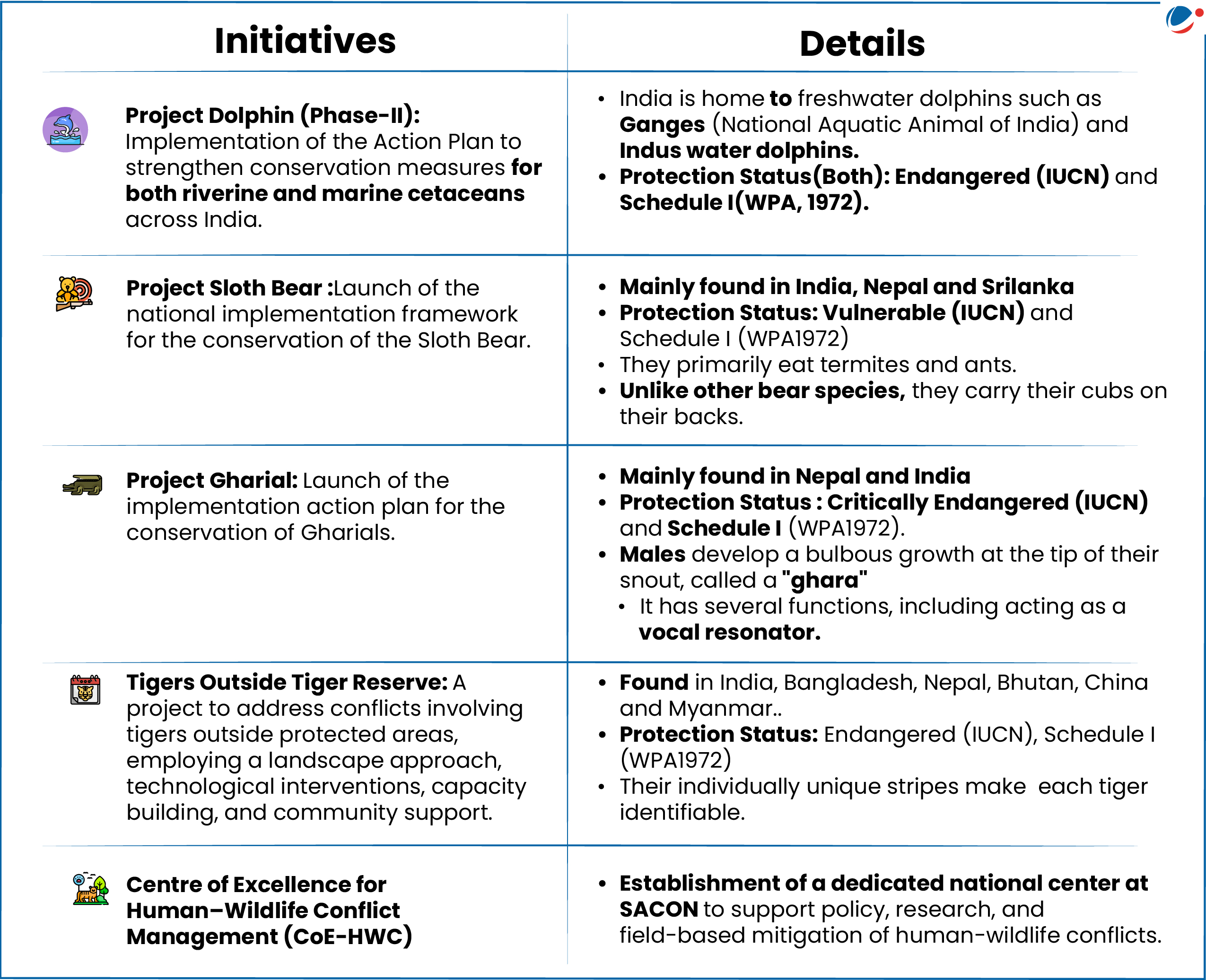- It includes 5 initiatives launched for Species Conservation and Conflict Management:-