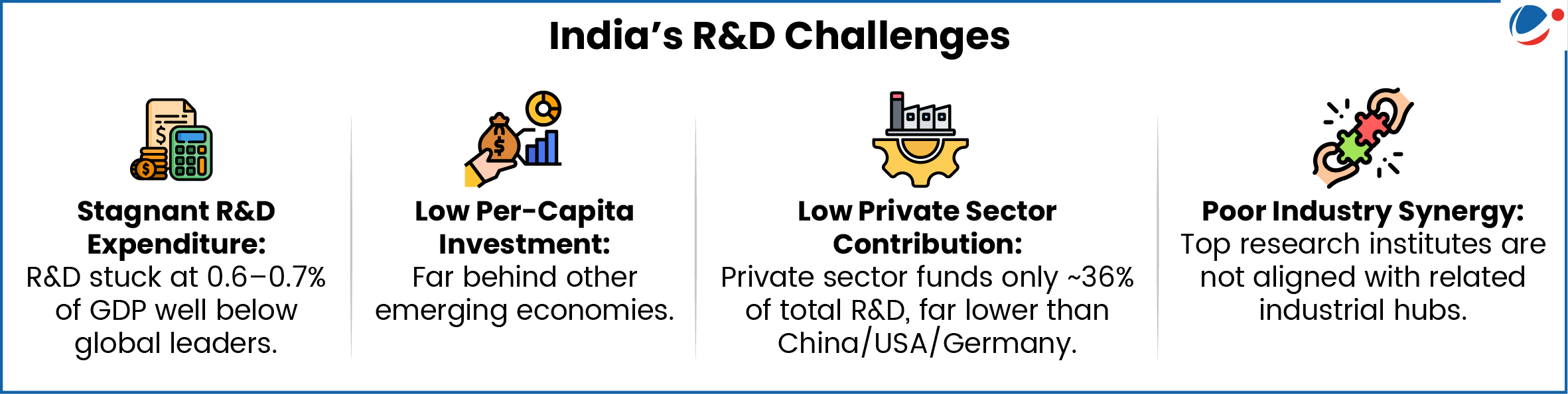 - Gross Expenditure on R&D (GERD): Reached approximately Rs. 2 lakh crores in 2020-21 (an eightfold increase over two decades) i.e. 0.6% to 0.7% of GDP.