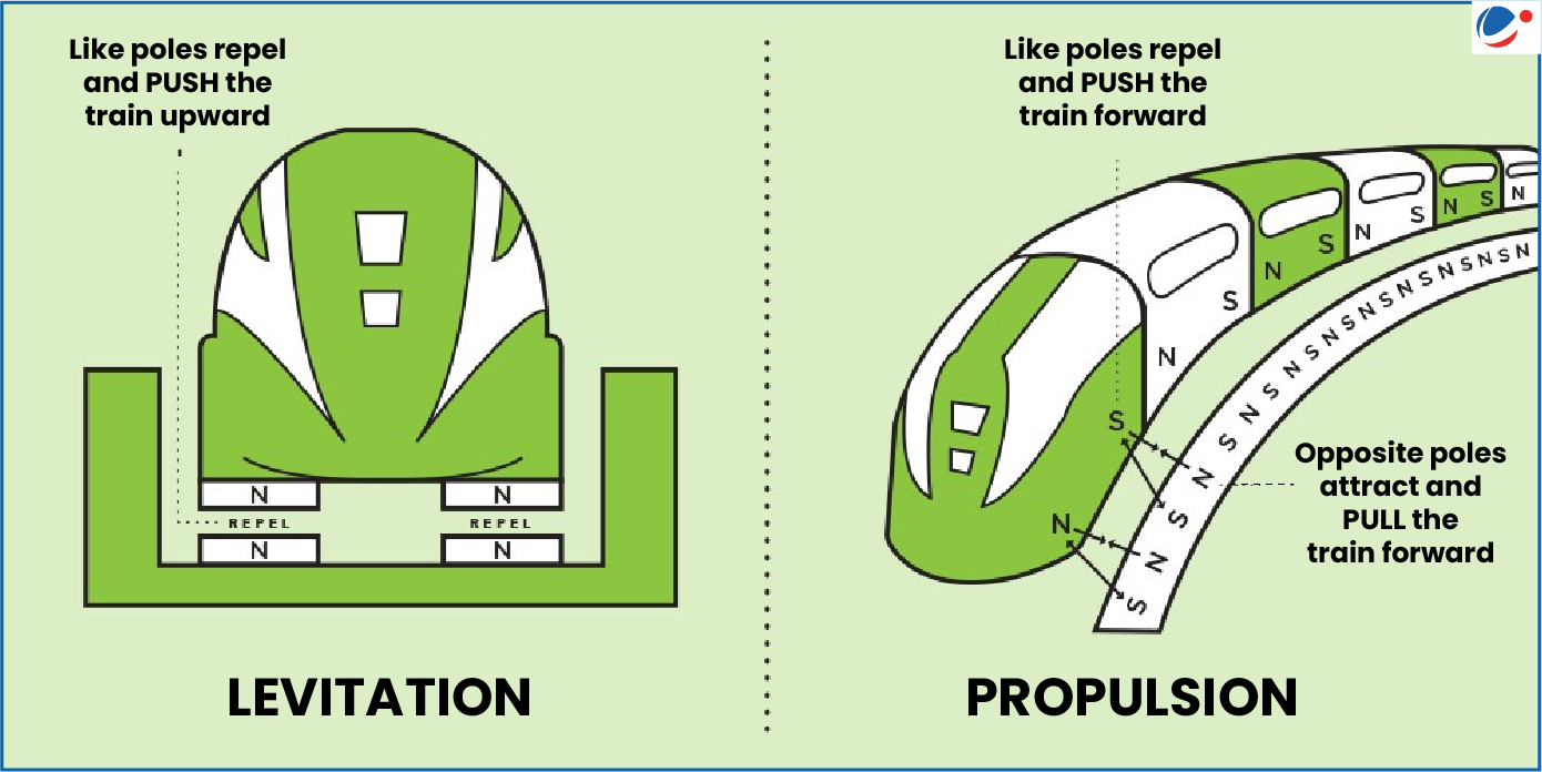 - Principle: Uses electromagnetic forces to levitate vehicles above the track, eliminating wheel–rail contact.