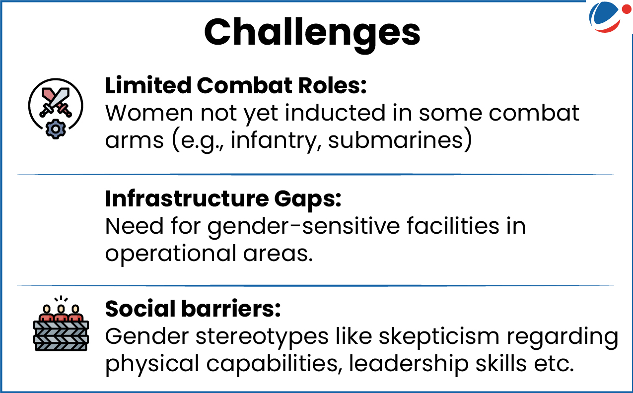 • Women contribute to operational capability, leadership, and UN peacekeeping missions, reflecting India's gender equality commitment.