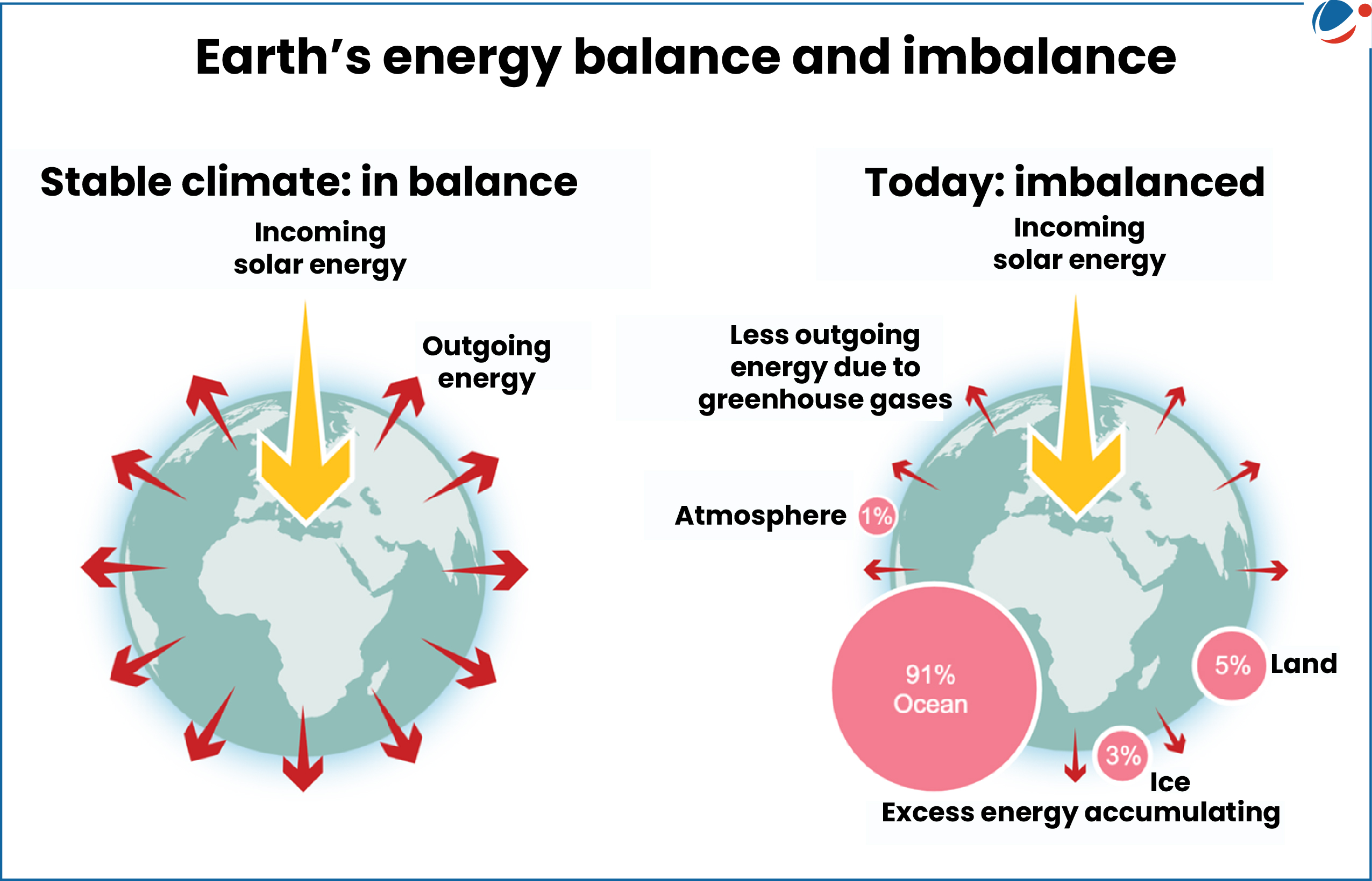 • It is the difference between amount of energy the Earth receives from the Sun (incoming solar radiation minus reflected solar radiation) and amount of energy the Earth radiates back into space (outgoing long-wave radiation). (see infographic)