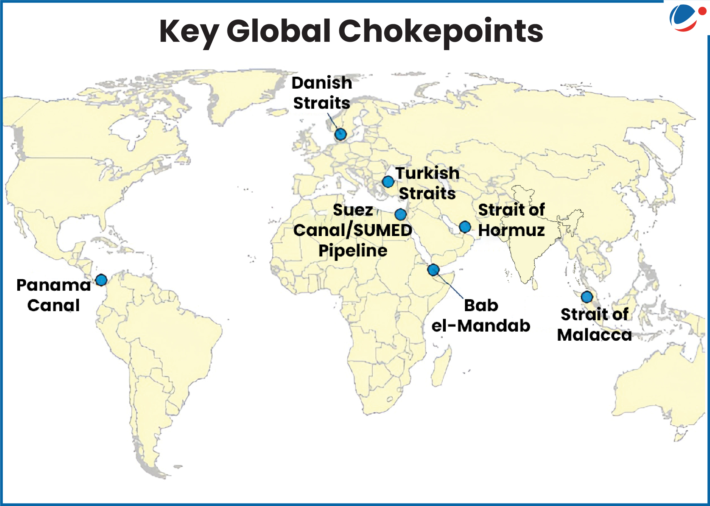 According to a report, over two-thirds of seaborne energy trade depends on a few key chokepoints. E.g. Strait of Hormuz, Strait of Malacca etc.