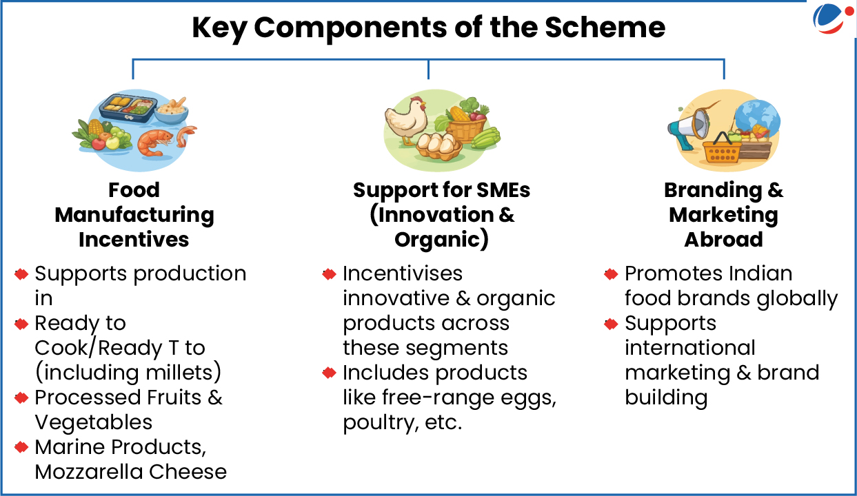 - Objectives: Create global food manufacturing champions, Promote Indian food brands internationally, Generate off-farm employment, Ensure better prices to farmers & higher income.