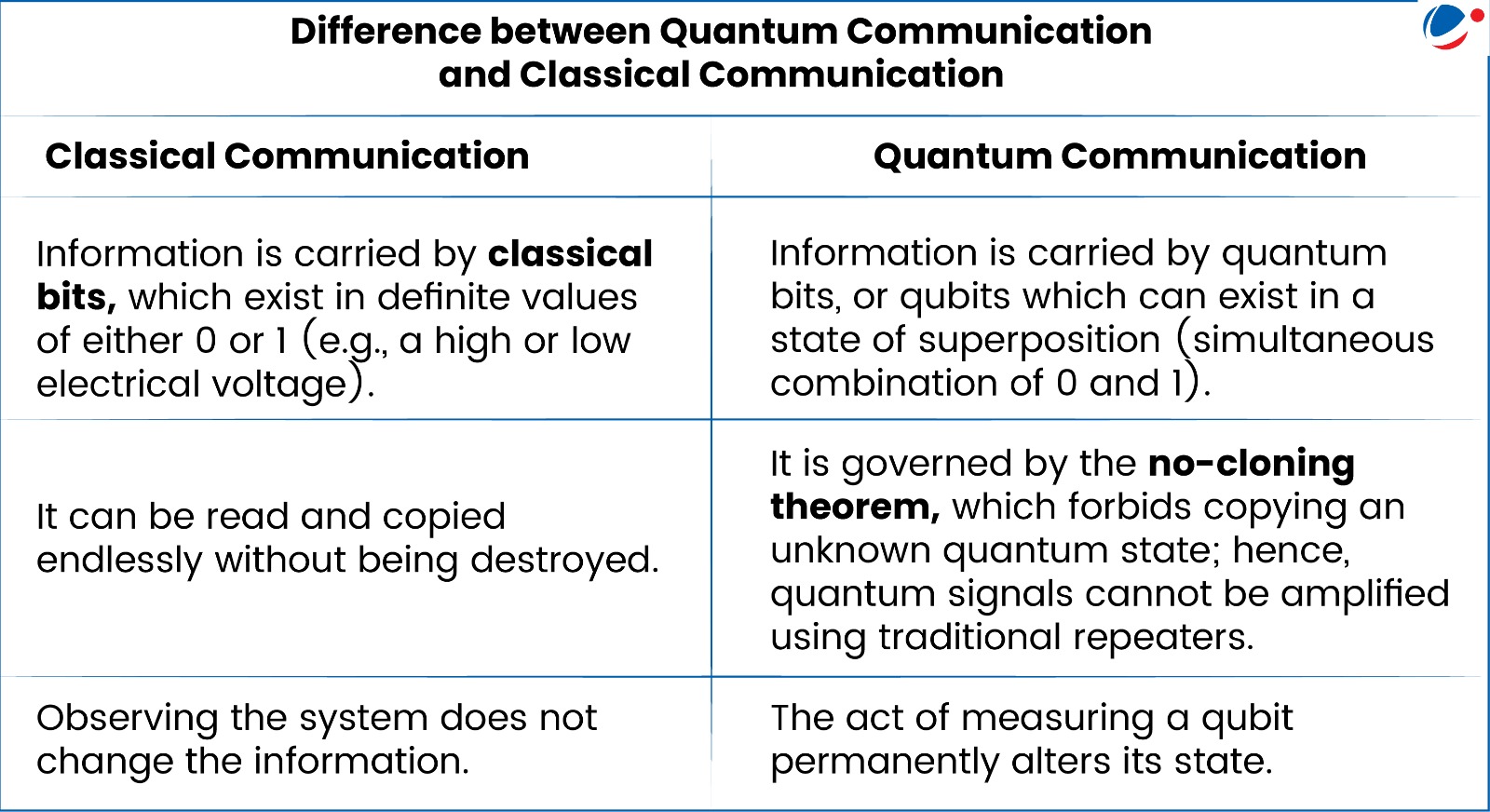 - Medium: similar to classical communication, quantum communication primarily uses light (single photons) to encode information, enabling fast and low-error transmission.