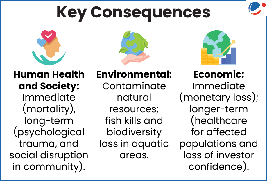 - 1984 Bhopal Gas Tragedy (leakage of methyl isocyanate); 1985 Oleum gas leak in Delhi; 2017 NTPC Unchahar (Uttar Pradesh) power plant boiler explosion; Vizag gas leak (2020); etc.