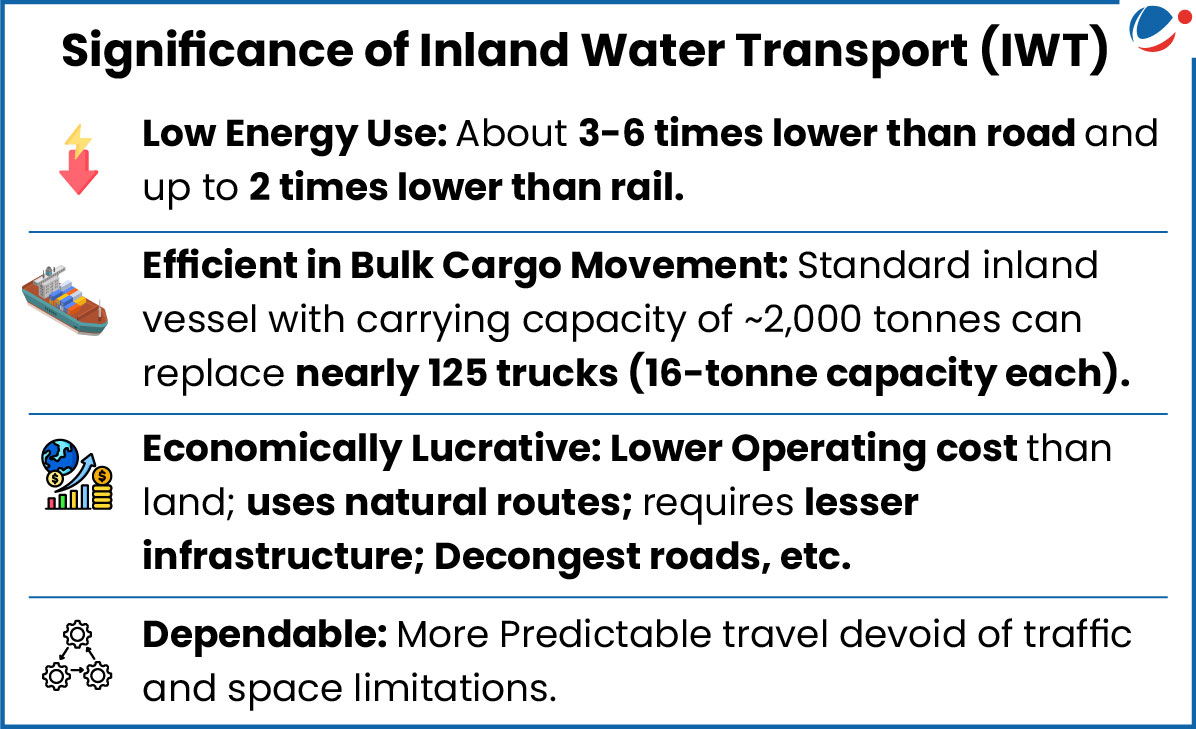 - Target: India targets to raise Inland Water Transport (IWT) modal share from 2% to 5% and expand cargo volumes to more than 200 MMT by 2030 (500 MMT by 2047) as per Maritime Amrit Kaal Vision.