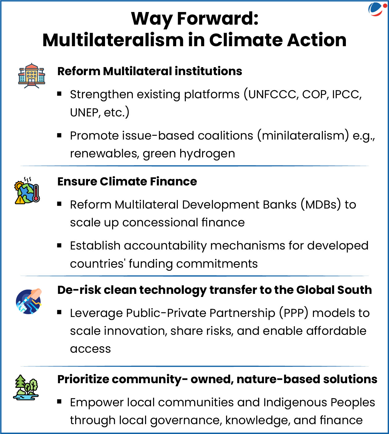 - Collective Governance: Establishes a rule-based order for sharing global responsibilities, preventing unilateralism and ensuring coordinated climate action. E.g. NDCs
