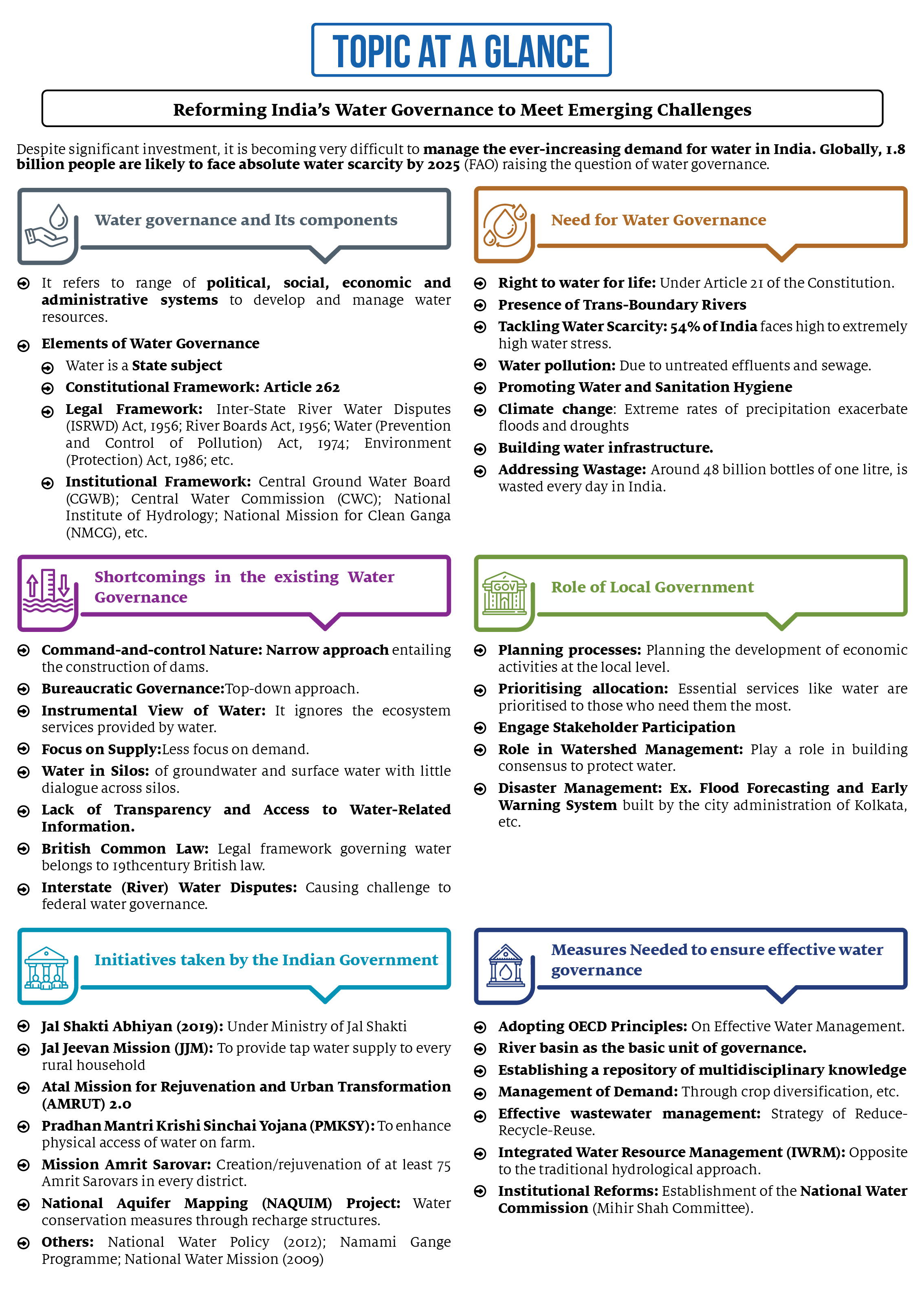 “Anyone who can solve the problems of water will be worthy of two Nobel Prizes- one for peace and one for science”. This quote by John F. Kennedy rightly captures the issue of poor water resource management coupled with governance challenges. Undoubtedly, clean water is a basic human right. Yet, 1.8 billion people are likely to face absolute water scarcity by 2025 [Food and Agriculture Organization (FAO)], hence arises the question of water governance.
